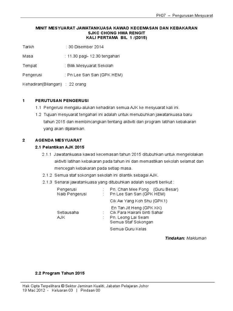 Contoh Minit Mesyuarat Kawad Kecemasan Dan Keselamatan