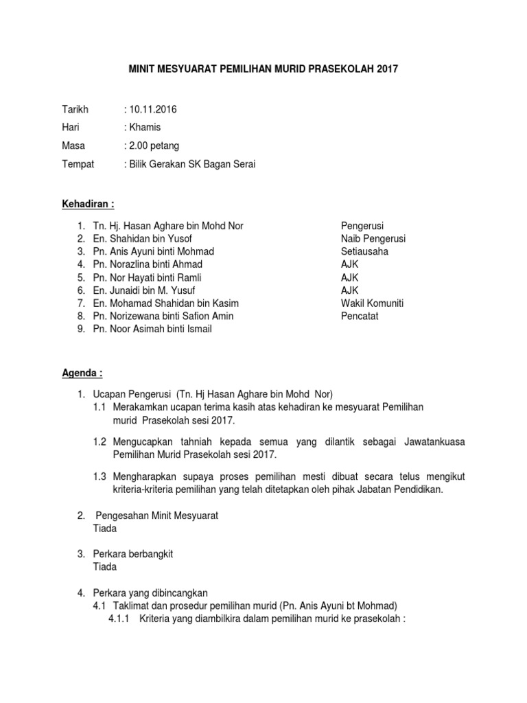 Contoh Penulisan Minit Mesyuarat Pdf Document