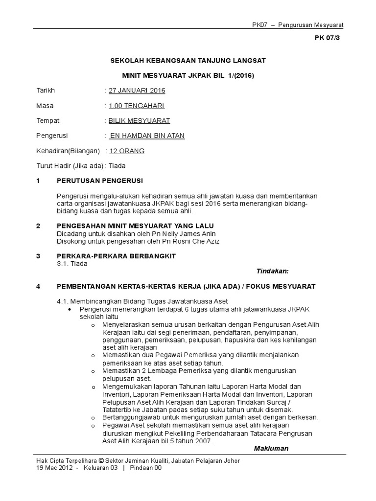 Minit Mesyuarat Pengurusan Aset Kerajaan Bil 1 2017 Doc
