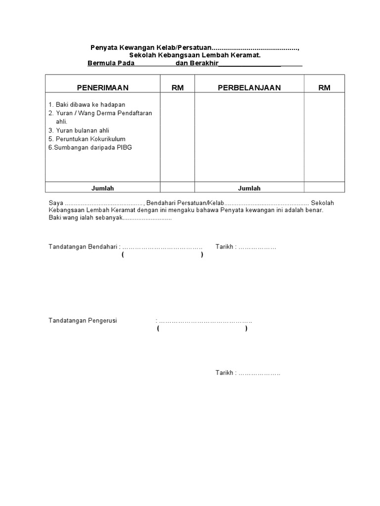 Contoh Penyata Kewangan Kelab Belia Taktik