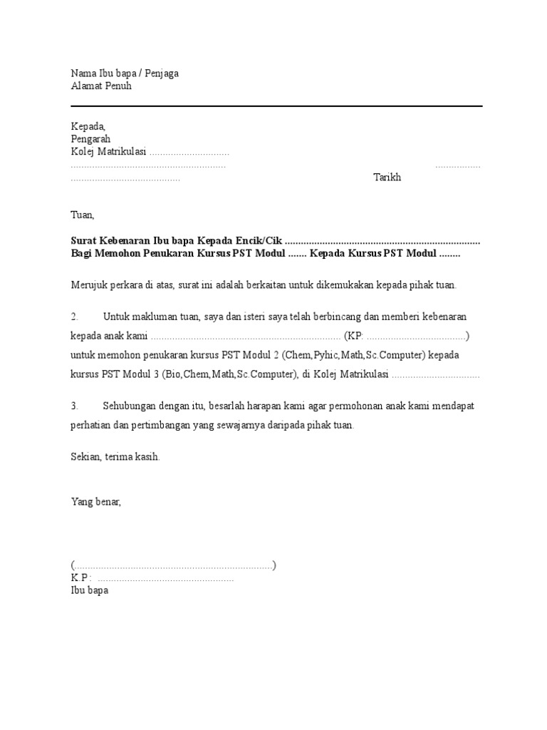 Contoh Surat Kebenaran Ibu Bapa Untuk Pertukaran Modul Matrikulasi