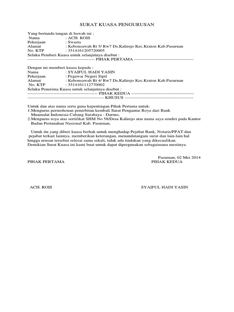 Contoh Surat Kuasa Pengurusan Sertifikat Tanah Doc Dapatkan Contoh