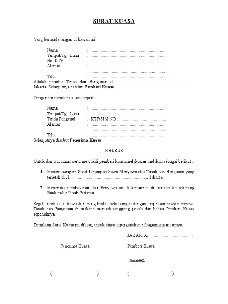 Contoh Surat Kuasa Tanah Dan Bangunan