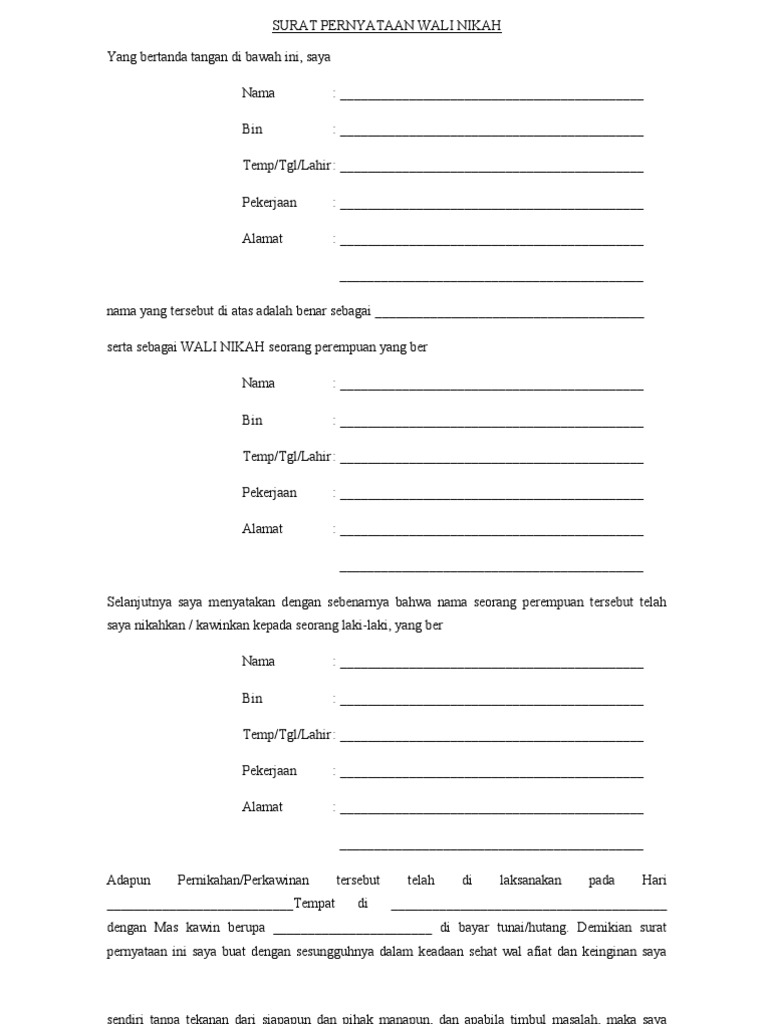 Surat Pernyataan Wali Nikah