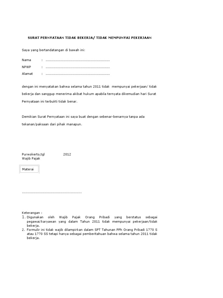 Formulir Contoh Surat Pernyataan Tidak Bekerja Bagi Wp Orang Pribadi