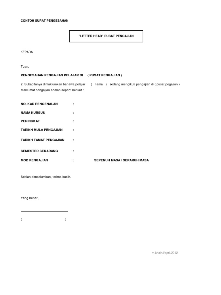 Contoh Surat Pengesahan Pelajar Dari Pusat Pengajian Pdf