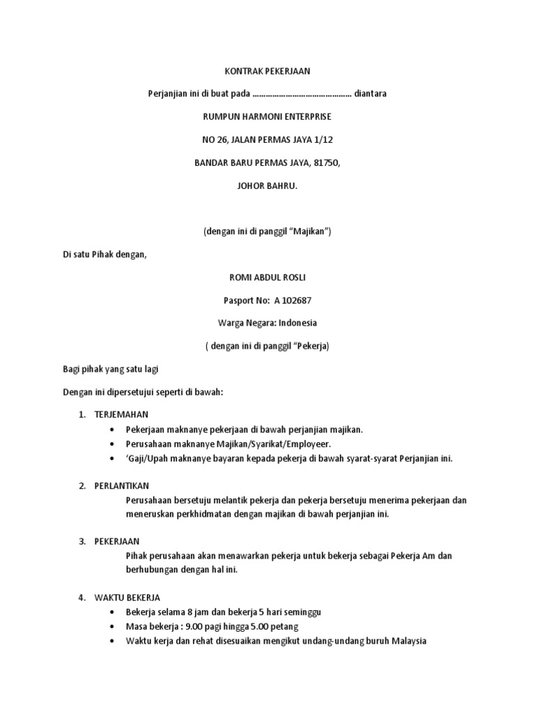 Contoh Surat Perjanjian Kontrak Kerja Malaysia