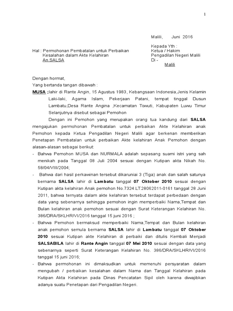 Contoh Surat Permohonan Pembatalan Akta Kelahiran Bagikan Contoh
