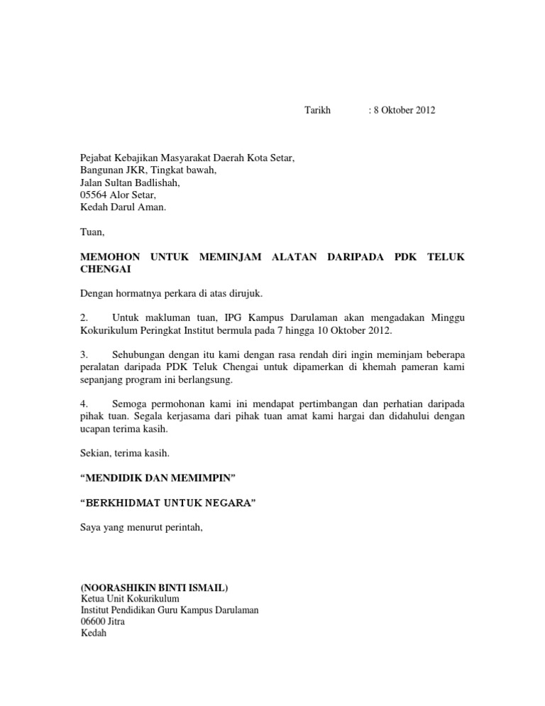 Contoh Surat Permohonan Peralatan Pejabat