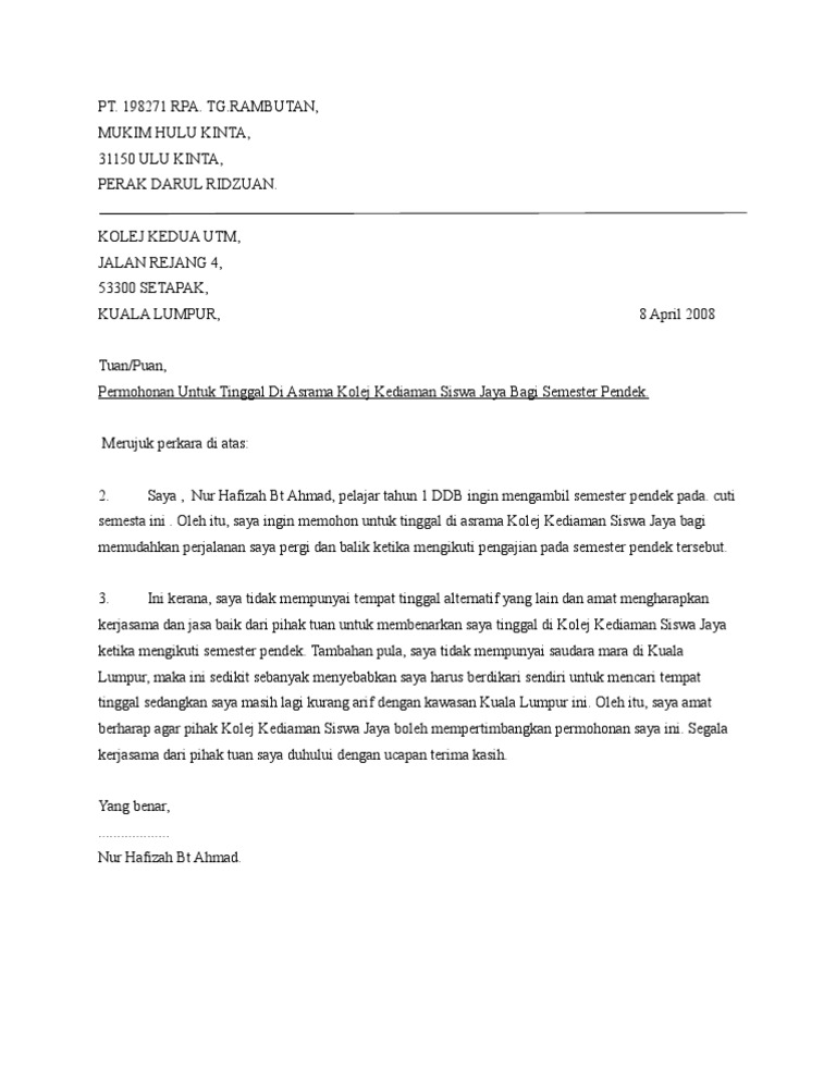 Surat Memohon Kebenaran Tinggal Di Asrama