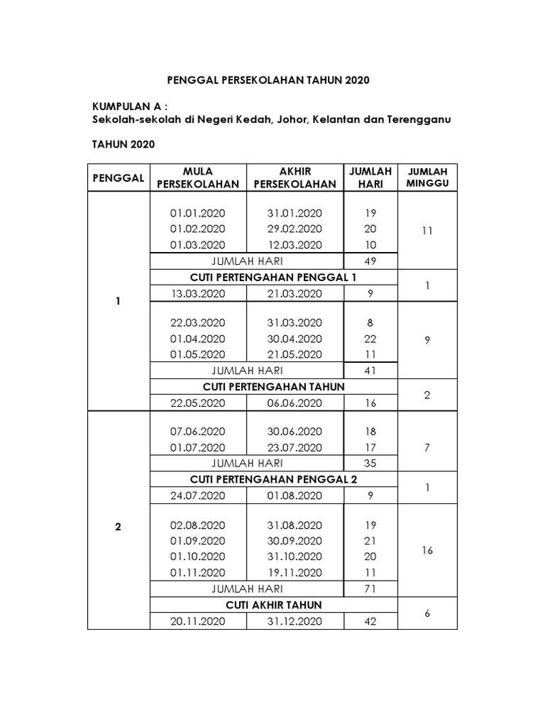 Cuti Sekolah 2020 Kalendar Takwim Penggal Persekolahan Kpm