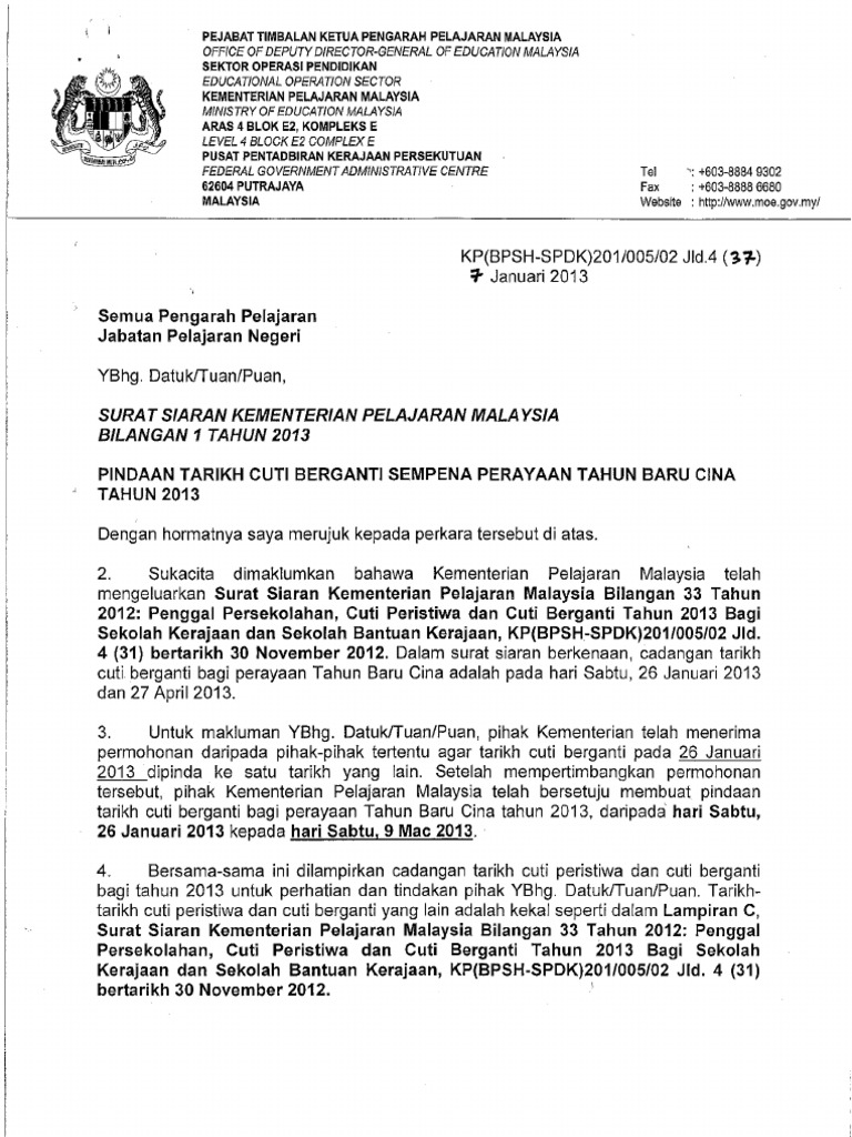 Surat Siaran Kpm Bil 1 2013 Pindaan Tarikh Cuti Berganti Sempena Perayaan Tahun Baru Cina Tahun 2013