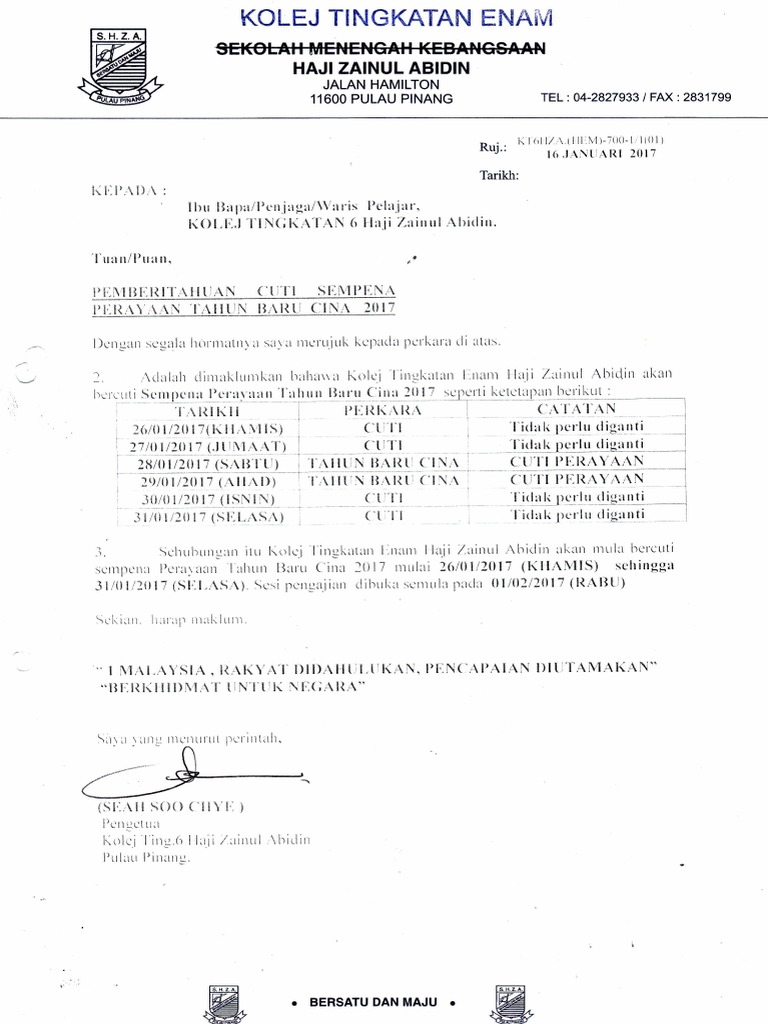 Cuti tahun baru cina sekolah 2017. Sekolah akan bermula cuti pada 26 januari sehingga 31 januari 2017 iaiu selama 6 hari sekolah akan dibuka semula pada hari rabu 1 februari 2017 harap maklum. Pihak sekolah mengucapkan selamat tahun baru cina kepada semua warga sekolah yang menyambutnya dan kepada semua masyarakat di malaysia. Cuti perayaan tarikh cuti. Cuti umum cuti kelepasan am persekutuan cuti kelepasan am negeri dan cuti persekolahan malaysia bagi tahun 2017.