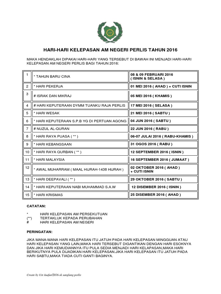 Kalendar Cuti Umum Dan Cuti Sekolah 2016