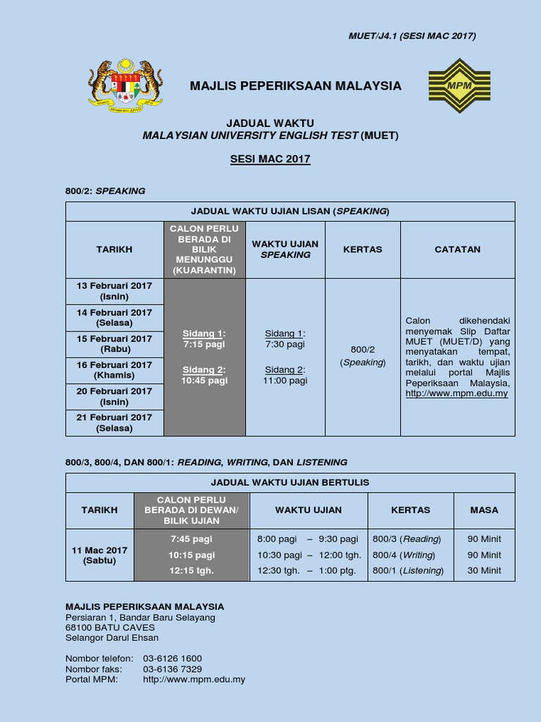 Pengumuman Muet Mac 2017 Btu Upm Edu My Bagi Keputusan Muet Yang Dikeluarkan Sebelum Tahun 2009