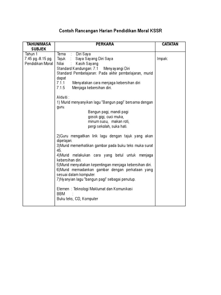Contoh Rancangan Harian Pendidikan Moral