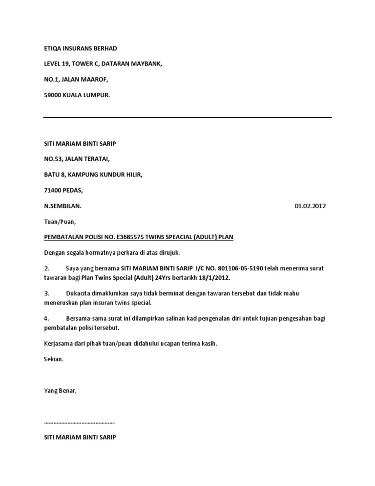 Etiqa Contoh Surat Pembatalan Polisi Insurans