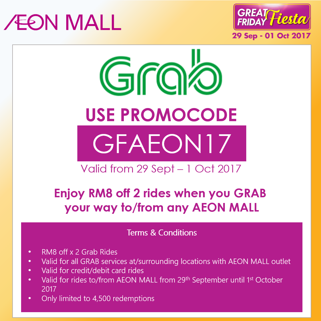 Grab Promo Code Rm8 Discount X 2 Rides To From Any Aeon Mall 29 September 1 October 2017