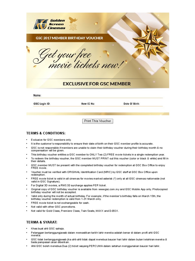 Golden Screen Cinemas Member Birthday Voucher 2017